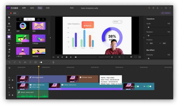 2、高效剪辑:内置强大视频剪辑功能及视频*,让你轻松制作专业视频。