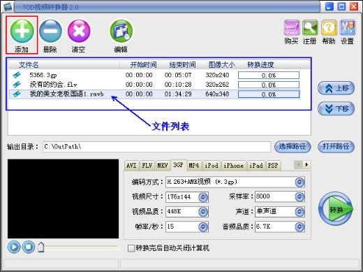 转换输出视频格式 3GP、3G2、MP4、H.264/MPEG-4 AVC、AVI、WMV、MPG、MOV、MKV、FLV 等格式