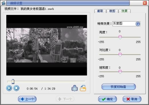 效果处理:点击效果选项,可以调节视频的亮度、对比度、饱和度,也可以在特殊效果中选择水平镜像、垂直镜像、灰度图和反色;