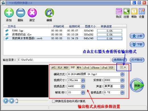 步骤5:图中红色框选中的就是输出格式,如选择输出3GP,对应下方是格式的编码及视频尺寸等参数设置,可以通过修改参数来控制输出文件大小和清晰度。蓝色框选中左右箭头,可以点击查看所有的输出格式;