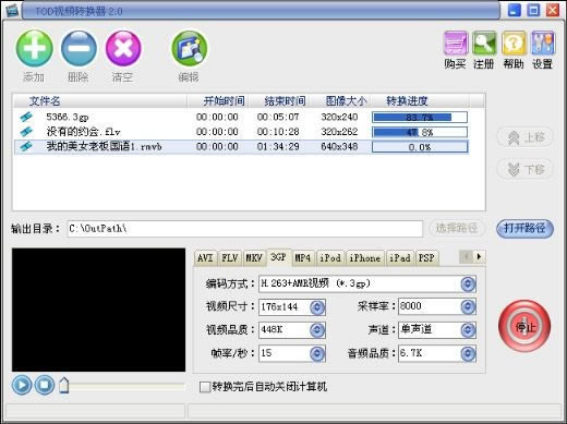 支持将流行数码摄像机拍摄的TOD视频转换为 MP4/3G2/3GP/VOB/MOV/FLV 等视频格式