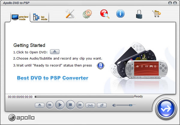 Apollo DVD to PSP是一款能够将DVD格式转换为PSP格式的格式转换工具软件,界面简洁简单实用,为用户解决DVD视频文件无法在PSP播放器播放的问题。