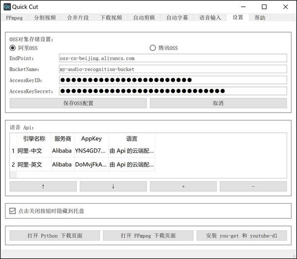 在 Quick Cut 里,我做了 语音自动转字幕 功能,可以使用阿里或腾讯的 Api。就以阿里的 API 为例,普通元套餐的商用价格是 2.5 元/小时,四十五几乎就是不要钱!下面的帮助里,我写下了申请阿里 API 的教程,只要填入 API,就可以使用语音转字幕了。