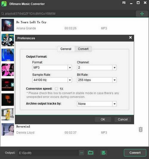 DRmare Music Converter 还允许您自定义输出音乐质量。如有必要,您可以更改音频参数,例如音频通道、采样率、比特率、编解码器等。此外,为了更轻松地管理 Spotify 音乐库,这款强大的工具还提供了按艺术家或专辑对输出曲目进行分类的选项自动地。