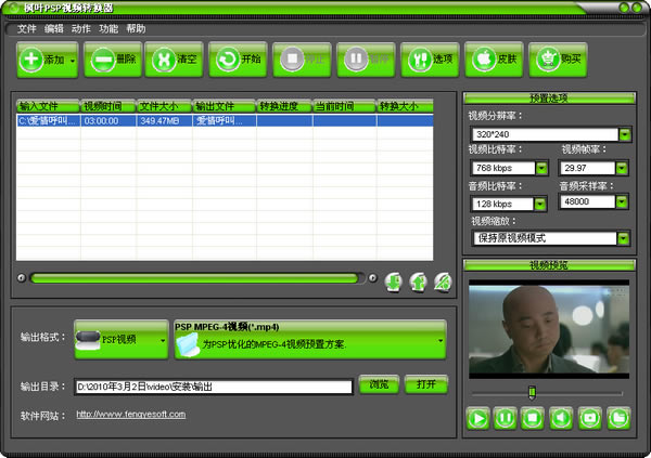 《枫叶PSP视频转换器》是一款功能强大、操作简单的一款PSP、PS3视频转换软件。用它您几乎可以将所有流行的视频格式转换为PSP、PS3所支持的MP4视频格式,以方便您在PSP、PS3、iPod、ipad、iPhone等支持MP4视频格式的移动设备上播放。如:将RM、RMVB、VOB、DAT、VCD、DVD、SVCD、ASF、FLV、SWF、MOV、QT、MPEG、WMV、MP4、3GP、DivX、XviD、AVI等视频文件转换为PSP、PS3所支持的MP4视频格式。针对PSP设有HD高清、高压缩、正常等各种预置效果,另外您可以任意设置转换的视频的清晰度,分辨率等等。转换过程极为简单、转换速度极快、转换质量极高。支持批量转换,支持视频转换同时预览,并且可以同时转换多个文件。